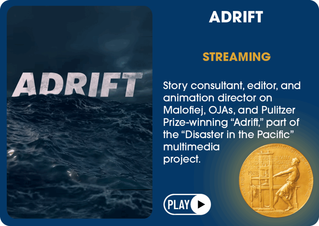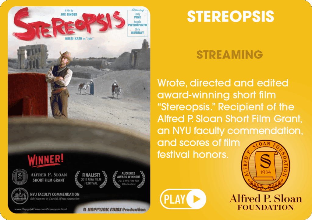 Joe brings years of compelling professional storytelling and the multifaceted capabilities and unique perspective of a diverse, non-traditional career across media and journalism. The payoffs of those non-traditional influences in building stories for narrative film, TV, video, documentary, art, and animation can be seen in the recognition those stories have received.